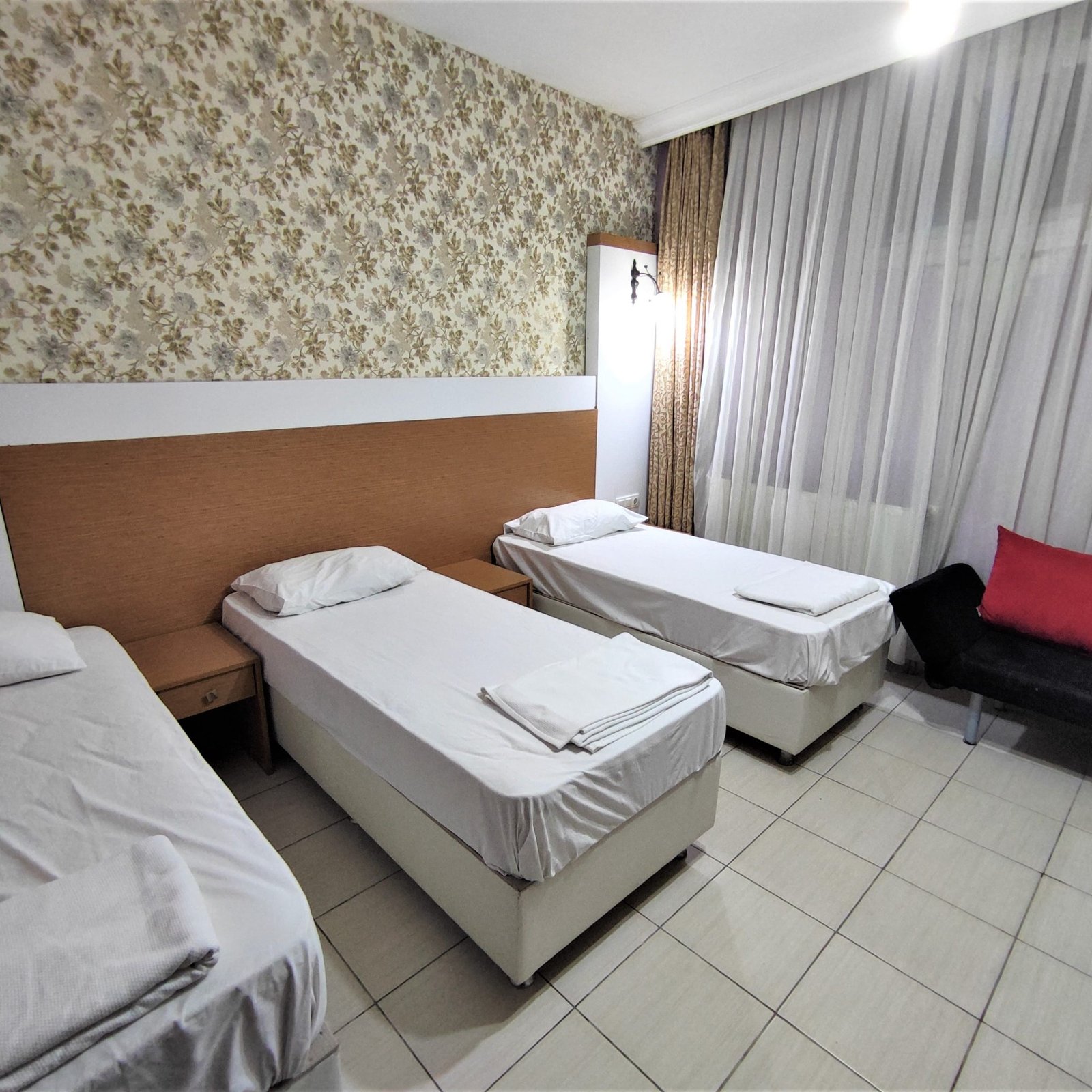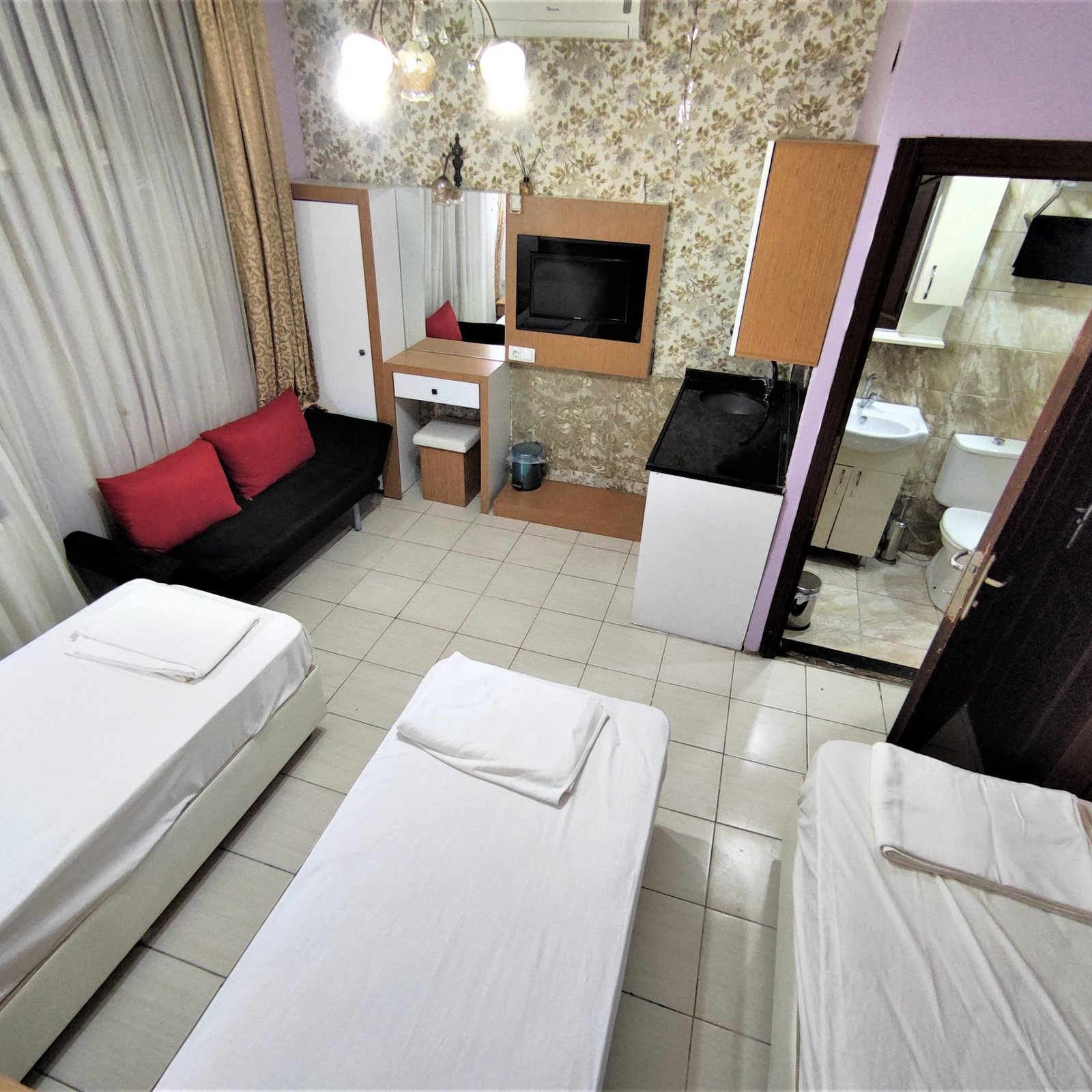 This room is designed for a comfortable and functional stay for up to three people. It features three single beds for a good night’s sleep, as well as a TV and air conditioner for entertainment and temperature control.